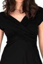 Der Ausschnitt ist vorne und hinten V-förmig und in der Größe dadurch etwas variabel. Die Drapierung eignet sich für kleinere und größere Körbchengrößen.