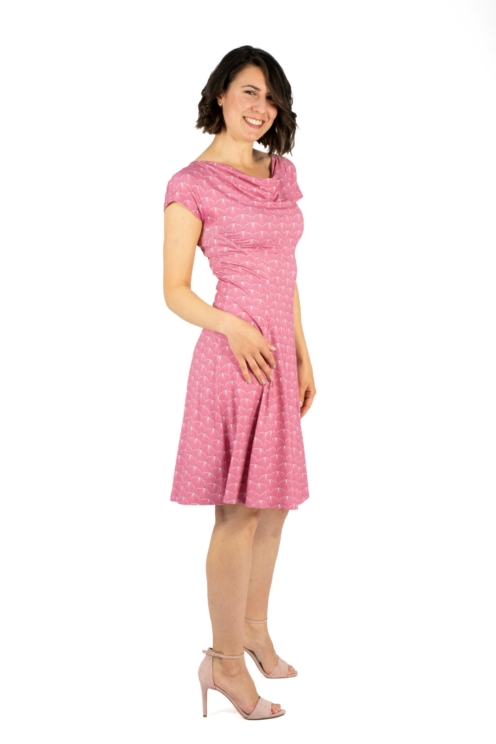 Der wunderbar weich fallende Ausschnitt umspielt ihr Dekolleté. Das kurze Ärmelchen ist angeschnitten und passt damit zu schmalen aber auch breiteren Schultern.