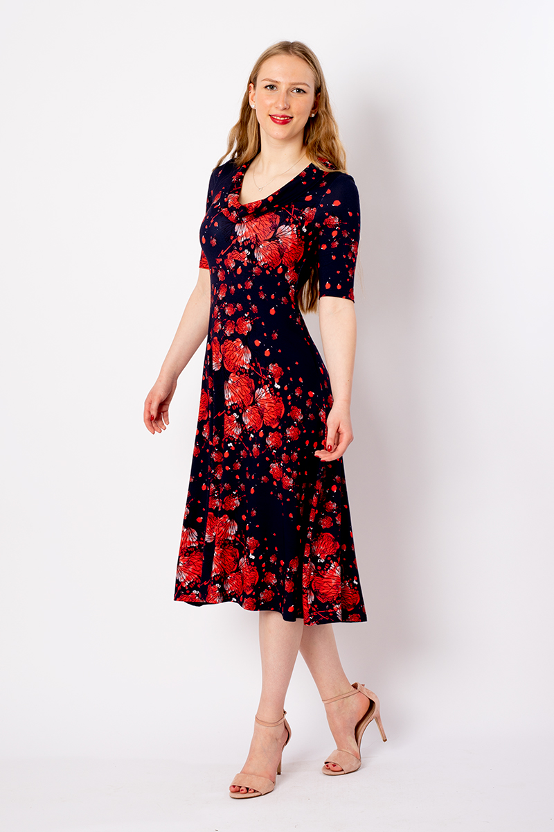 Unser Kleid Merle ist die entspannt feminine Freundin für den kleinen oder größeren Auftritt. Ob mit dezentem Print oder unifarben, Merle macht sowohl tagsüber als auch abends Freude und eine gute Figur. Die halblangen Ärmel und viel Weite in der Körpermitte schmeicheln den Kurven und die Midilänge streckt die Silhouette. Mit schwingendem Rock in A-Linie und weich fallendem Schalkragen glänzt sie auch beim Theaterbesuch oder der Geburtstagsfeier. Aus komfortablem Viscose-Jersey gefertigt ist sie immer bequem und pflegeleicht.