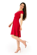 Der außergewöhnlich schöne Ausschnitt setzt ihr Dekolleté in Szene. Prinzessnähte sorgen für eine optimale Passform und strecken die Figur. Der raffinierte Gürtel Wendegürtel zaubert eine Wespentaille. Für eine ruhigere Vorderansicht kann der Gürtel auch im Rücken getragen werden. Weibliche Hüften werden von dem glockigen Rock weich umspielt. Der Saum hat eine schwingende Weite und lädt zum Tanzen ein. Es hat einen sommerlichen Kurzarm.
